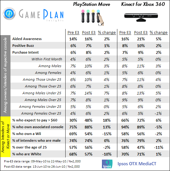Interest in these new motion control peripherals among specific demo groups reveals that young males were the ones most immediately impacted by the events of E3. Purchase intent among males under 25 increased by 5% for Kinect and by 7% for Move. This should come as no surprise given the extensive E3 coverage on G4 as well as on young male targeted gaming portals such as IGN and GameSpot.